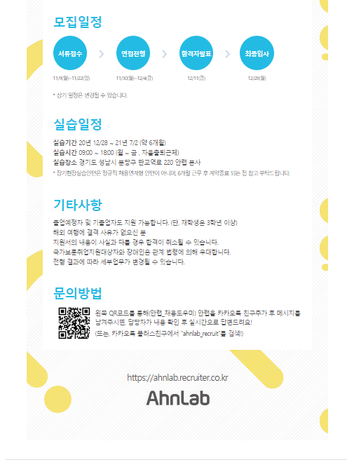 2021 안랩 장기현장실습 인턴 채용 공고입니다 ! (비전환형)